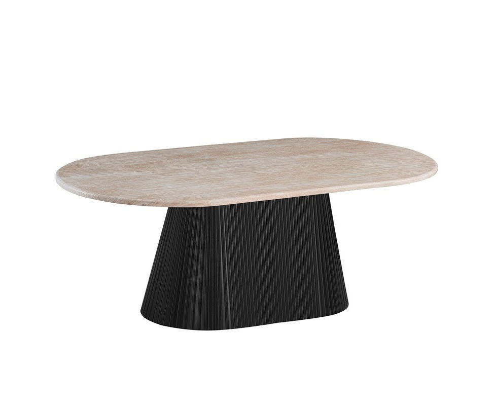 De Kimberly ovale salontafel combineert moderne elegantie met een luxueus blad van imitatiemarmer en vormt zo een verfijnd middelpunt in elke woonruimte.